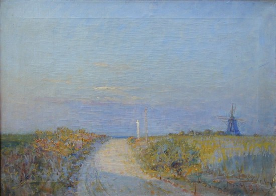 Hugo Larsen: Landskab med mølle, 1913. Olie på lærred, 47 x 65 cm. Privateje.