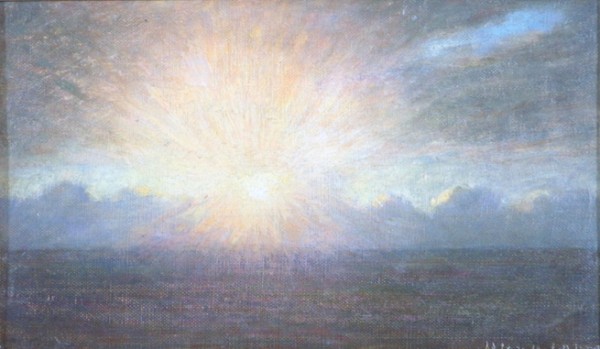 Hugo Larsen: Solopgang på Alheden, ca. 1900, olie på plade, 17 x 28 cm. Privateje. Foto: Holstebro Auktioner (ho-auk.dk).