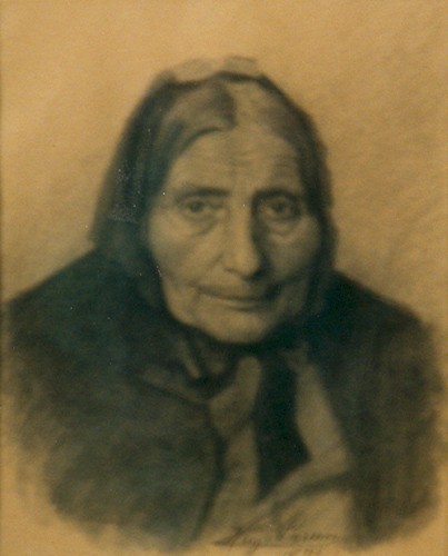 Hugo Larsen: Marie Magdalene Bjørneboe, g. Strip (kunstnerens mormor), 1895, sortkridt, 29 x 33 cm. Privateje. Privat foto.