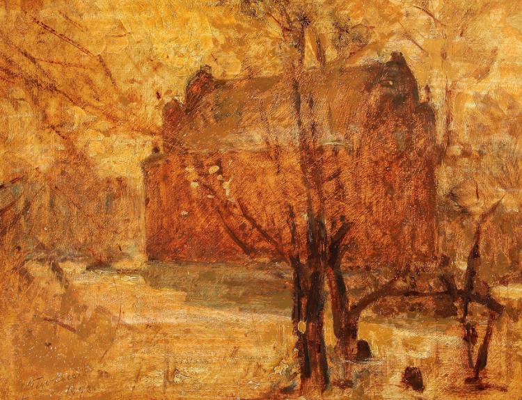 Hugo Larsen: Hesselagergaard, 1933, olie på malepap, 27 x 34 cm. Foto: Bruun Rasmussen (www.bruun-rasmussen.dk).