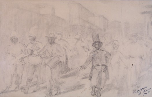 Hugo Larsen: A Carnival Procession, St. Thomas 1905. Charcoal and pencil on paper, 26 x 41.5 cm. Private collection.